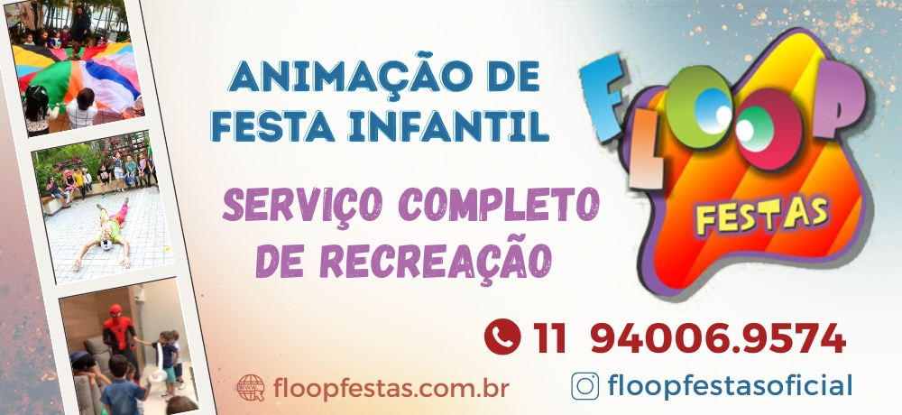 Floop Festas oferece animação completa para festas infantis, com brincadeiras, gincanas, oficinas de arte, esculturas em balões, tatuagens artísticas e muito mais! Também há pacotes de recreação teen, aluguel de brinquedos, barraquinhas, show de mágica, caricaturista, DJs, dançarinos malucos e muita diversão. Floop Festas: um espetáculo de alegria!
