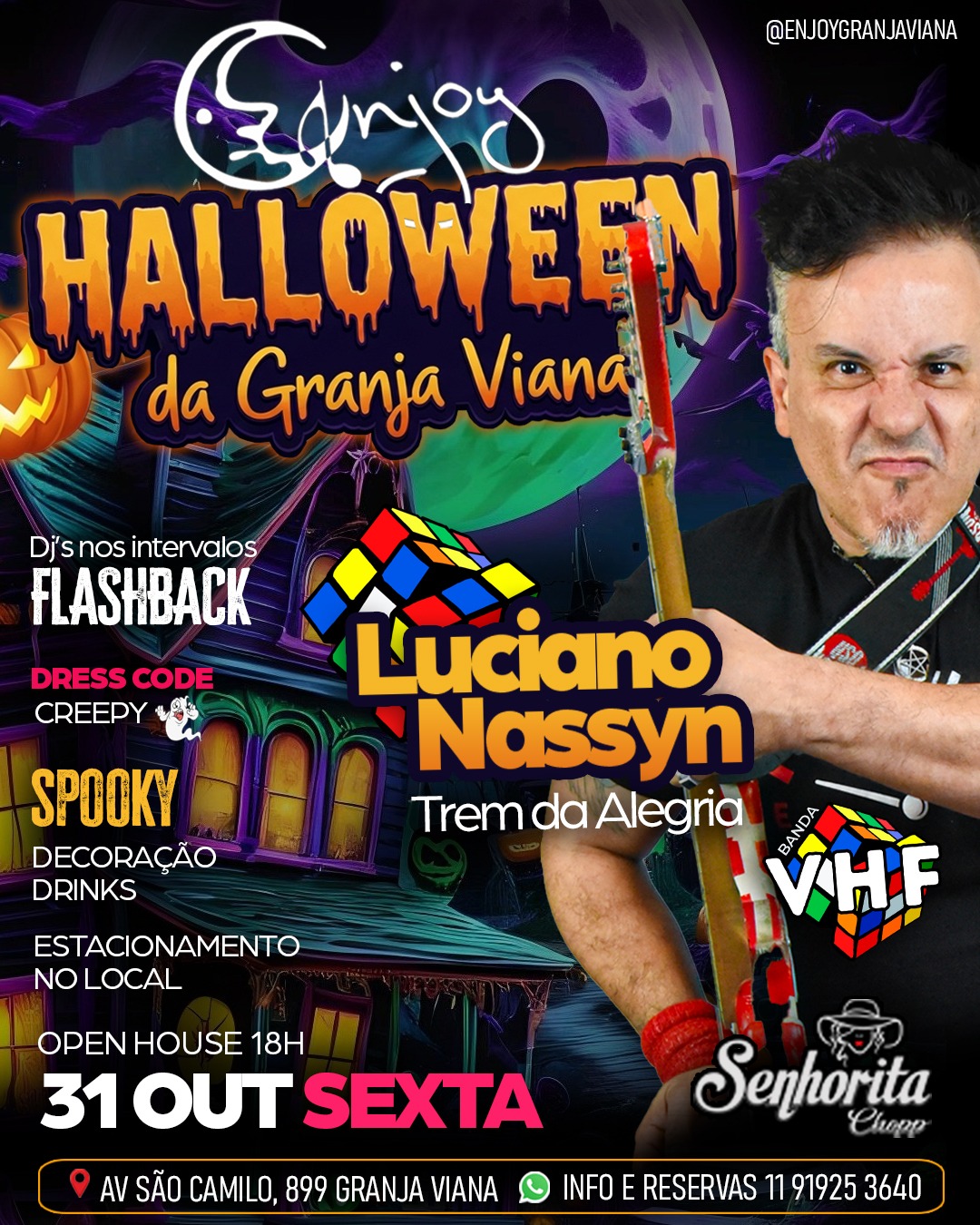 Prepare sua fantasia — ou vista-se de preto — e venha viver uma noite inesquecível no Enjoy Granja Viana, na sexta, 31 de outubro! A casa vai se transformar em um cenário digno dos filmes mais assustadores (e elegantes!) de Hollywood, com decoração temática, iluminação especial e aquele toque de bom gosto que todo mundo conhece no Enjoy.