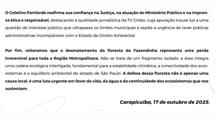 Mas, segundo o Coletivo PanVerde, esse argumento não se sustenta. A área passou por mais de quarenta anos de regeneração natural, formando uma nova floresta, protegida pela Lei da Mata Atlântica e pelo Código Florestal. A entidade lembra que a Justiça reconheceu esse “novo fato ecológico” e suspendeu o desmatamento, justamente por se tratar de uma floresta viva — e não de um terreno abandonado dos anos 70.