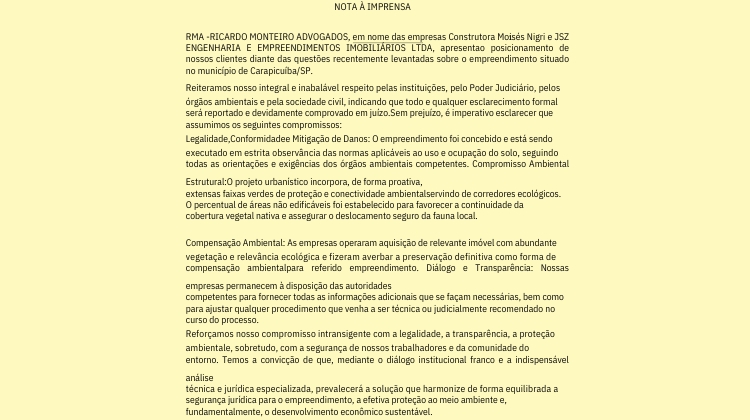 Monteiro classificou a ação movida pelo Instituto Nina Rosa como “enviesada” e afirmou que a CETESB matriz irá defender a validade da licença. Ele também reforçou a idoneidade das empresas, que atuam há mais de 50 anos no setor, e disse que a liminar decorre de “um cenário de crescente desconfiança em relação a loteamentos”, o que será devidamente esclarecido no processo.