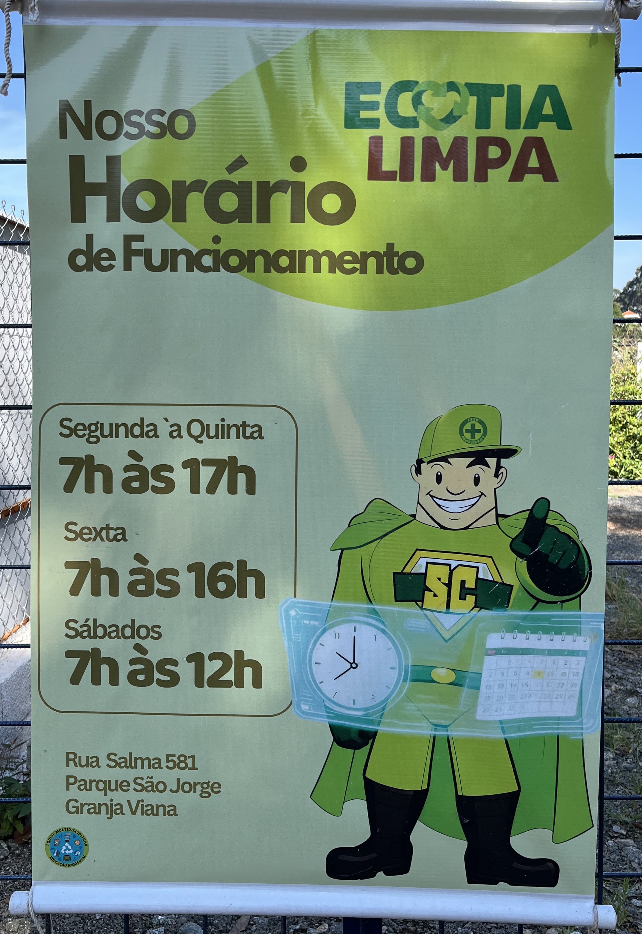 EcoPonto “Ecotia Limpa” recebe materiais recicláveis (plástico, papel, papelão, vidro, metais) e entulho de construção civil (de pequenas reformas).