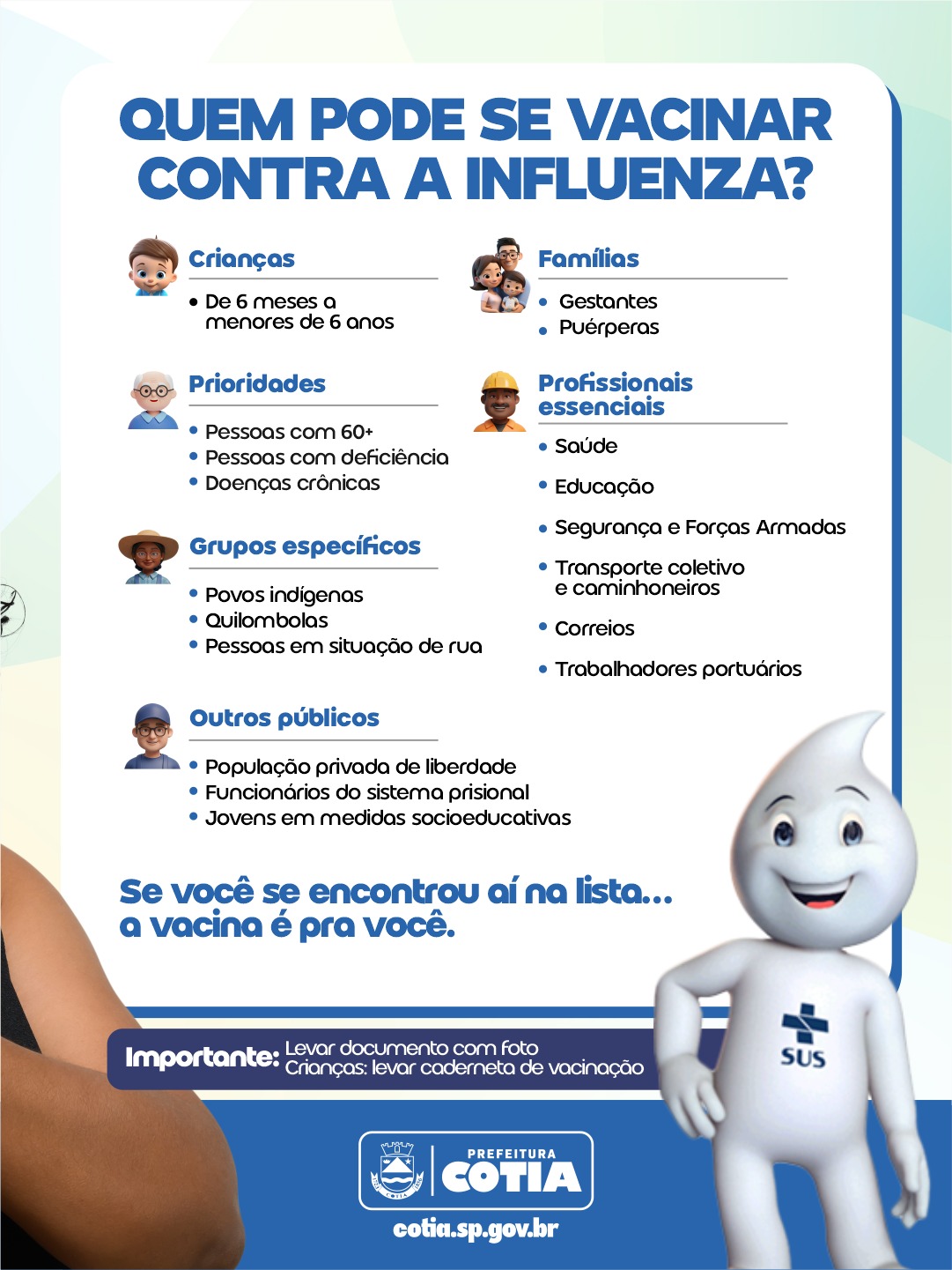Para receber a vacina, é necessário apresentar um documento com foto. No caso de crianças, também é exigida a carteirinha de vacinação. A ação é voltada aos grupos prioritários definidos na campanha: crianças de seis meses a seis anos, pessoas com 60 anos ou mais e gestantes.