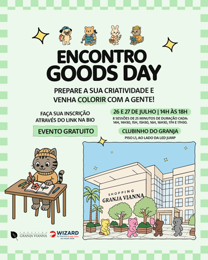 “As oficinas do Goods Day reforçam nosso compromisso de oferecer experiências culturais, acessíveis e encantadoras para o nosso público. Queremos ser um espaço onde a imaginação floresce e boas memórias são construídas”, explica Fabiana Tartaglione, coordenadora de Marketing do Shopping Granja Vianna.